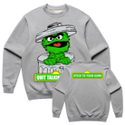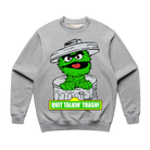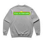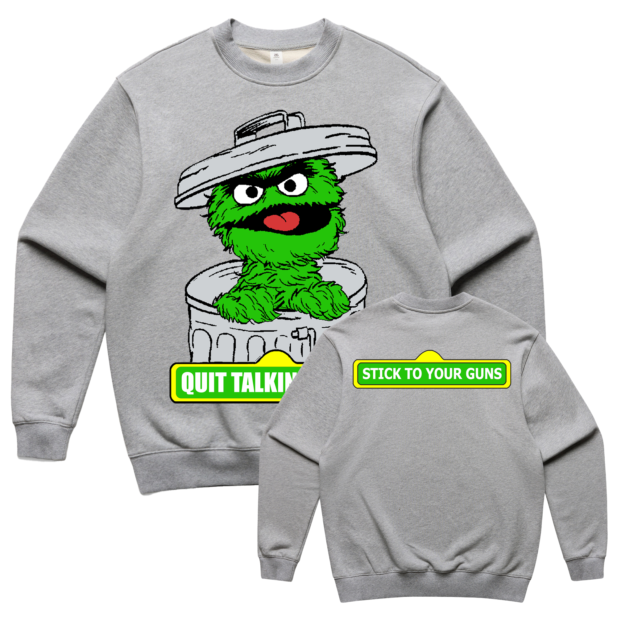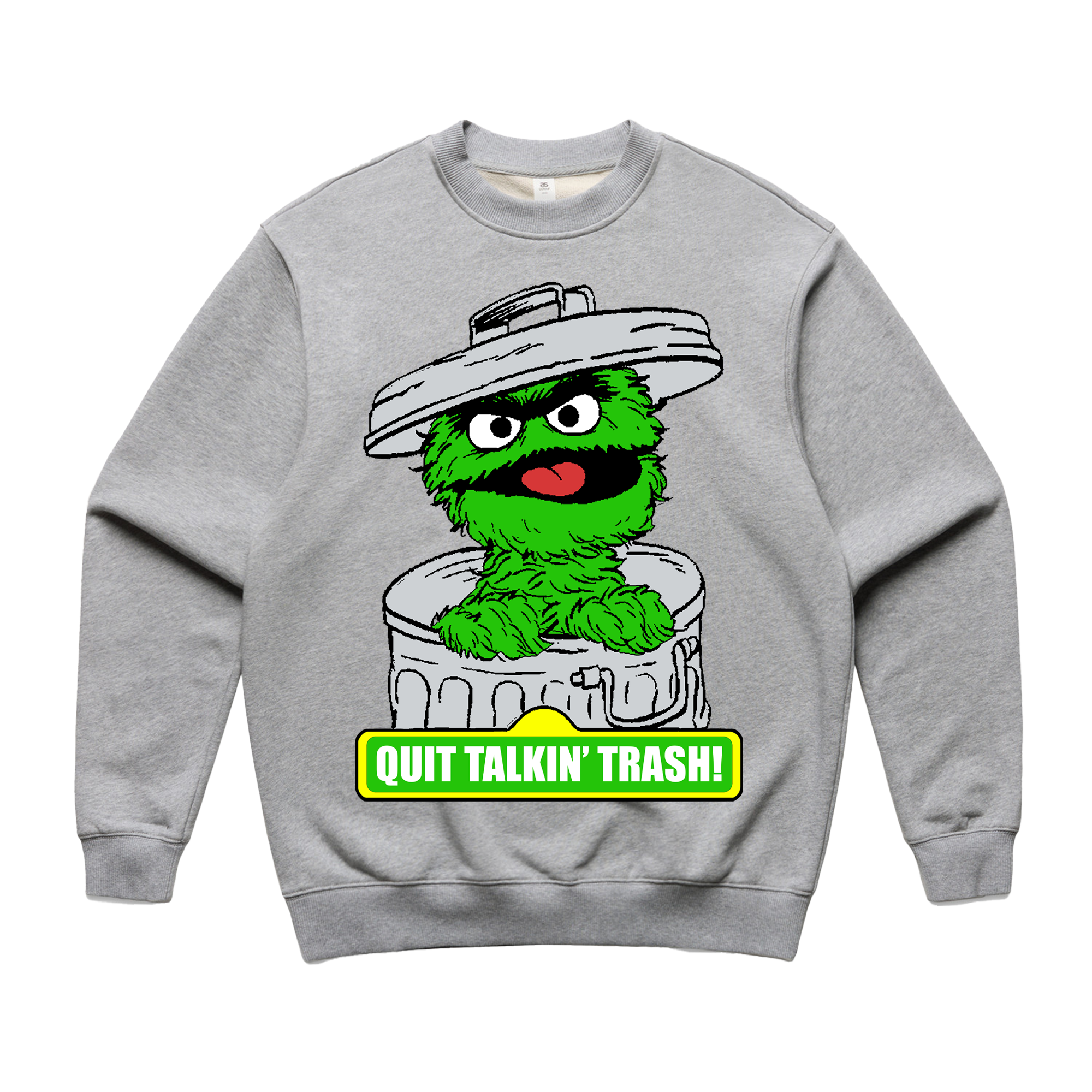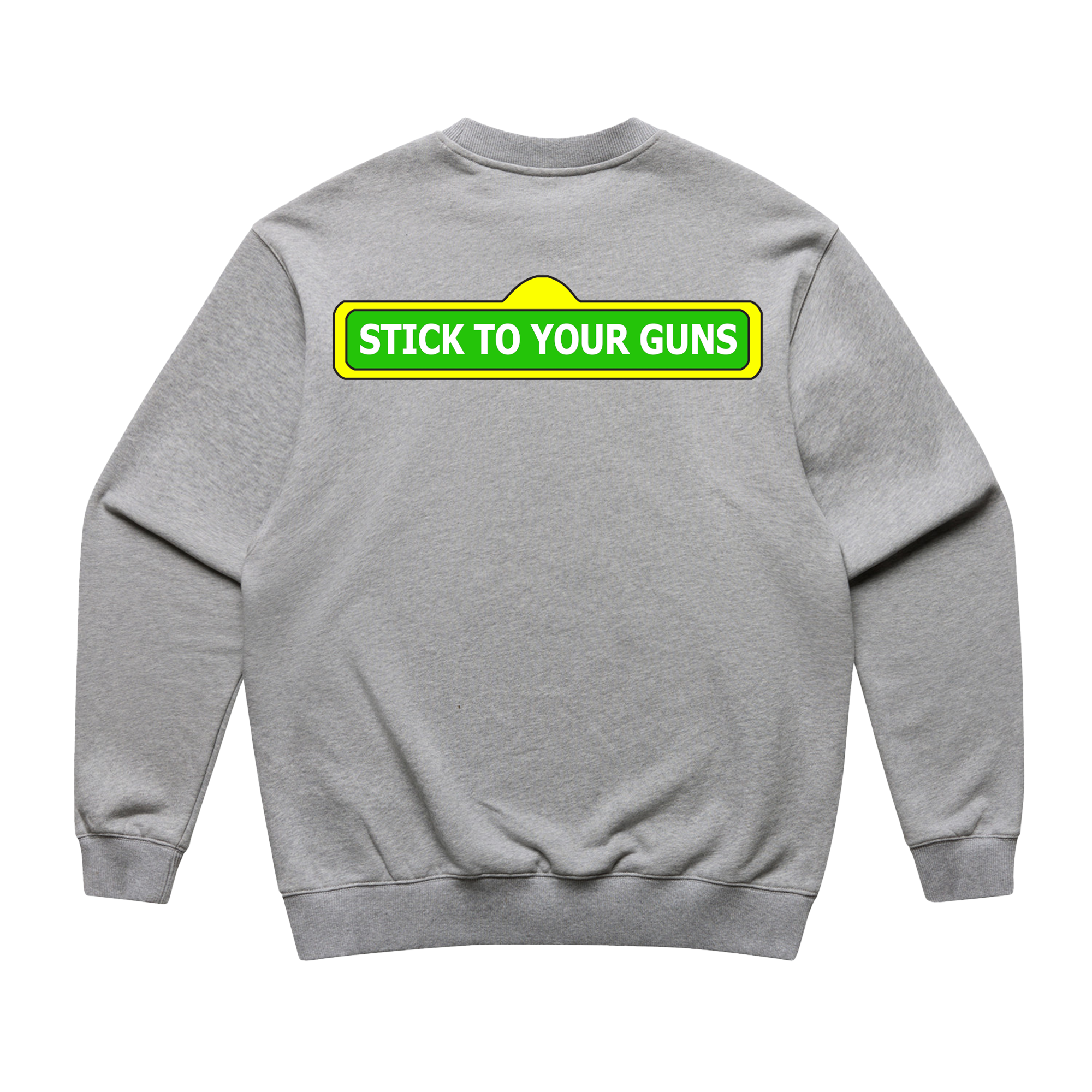 Heather grey crewneck sweatshirt. Printed on Gildan brand garments.